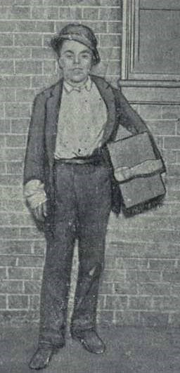 From among a hundred and forty hands on two big lofts in a Suffolk Street factory we picked seventeen boys and ten girls who were patently under fourteen years of age, but who all had certificates, sworn to by their parents, to the effect that they were sixteen. One of them whom we judged to be between nine and ten, and whose teeth confirmed our diagnosis—the second bicuspids in the lower jaw were just coming out—said that he had worked there “by the year.” The boss, deeming his case hopeless, explained that he only “made sleeves and went for beer.” Two of the smallest girls represented themselves as sisters, respectively sixteen and seventeen, but when we came to inquire which was the oldest, it turned out that she was the sixteen-year one. Several boys scooted as we came up the stairs. When stopped they claimed to be visitors. I was told that this sweater had been arrested once by the Factory Inspector, but had successfully barricaded himself behind his pile of certificates. I caught the children laughing and making faces at us behind our backs as often as these were brought out anywhere. In an Attorney Street “pants” factory we counted thirteen boys and girls who could not have been of age, and on a top floor in Ludlow Street, among others, two brothers, sewing coats, who said that they were thirteen and fourteen, but, when told to stand up, looked so ridiculously small as to make even their employer laugh. Neither could read, but the oldest could sign his name and did it thus, from right to left: