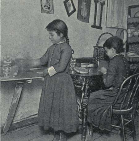 Another lesson we may learn with advantage from some old-country governments, which we are apt to look down upon as “slow,” is to punish the parents for the truancy of their children, whether they are found running in the street or working in a shop when they should have been at school. Greed, the natural child of poverty, often has as much to do with it as real need. In the case of the Italians and the Jewish girls it is the inevitable marriage-portion, without which they would stand little chance of getting a husband, that dictates the sacrifice. One little one of twelve in a class in the Leonard Street School, who had been working on coats in a sweat-shop nine months, and had become expert enough to earn three dollars a week, told me that she had $200 in bank, and that her sister, also a worker, was as forehanded. Their teacher supported her story. But often a meaner motive than the desire to put money in bank forges the child’s fetters. I came across a little girl in an East Side factory who pleaded so pitifully that she had to work, and looked so poor and wan, that I went to her home to see what it was like. It was on the top floor of a towering tenement. The mother, a decent German woman, was sewing at the window, doing her share, while at the table her husband, a big, lazy lout who weighed two hundred pounds if he weighed one, lolled over a game of checkers with another vagabond like himself. A half-empty beer-growler stood between them. The contrast between that pitiful child hard at work in the shop, and the big loafer taking his ease, was enough to make anybody lose patience, and I gave him the piece of my mind he so richly deserved. But it rolled off him as water rolls off a duck. He merely ducked his head, shifted his bare feet under the table, and told his crony to go on with the play.