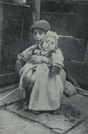 Of Susie’s hundred little companions in the alley—playmates they could scarcely be called—some made artificial flowers, some paper-boxes, while the boys earned money at “shinin’” or selling newspapers. The smaller girls “minded the baby,” so leaving the mother free to work. Most of them did something toward earning the family living, young as they were. The rest did all the mischief. The occupations that claim children’s labor in and out of the shop are almost as numberless as the youngsters that swarm in tenement neighborhoods. The poorer the tenements the more of them always. In an evening school class of nineteen boys and nine girls which I polled once I found twelve boys who “shined,” five who sold papers, one of thirteen years who by day was the devil in a printing-office, and one of twelve who worked in a wood-yard. Of the girls, one was thirteen and worked in a paper-box factory, two of twelve made paper lanterns, one twelve-year-old girl sewed coats in a sweat-shop, and one of the same age minded a push-cart every day. The four smallest girls were ten years old, and of them one worked for a sweater and “finished twenty-five coats yesterday,” she said with pride. She looked quite able to do a woman’s work. The three others minded the baby at home; one of them found time to help her mother sew coats when baby slept.