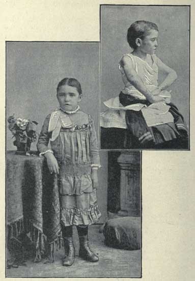 CASE NO. 25,745 ON THE SOCIETY BLOTTER: ANNIE WOLFF, AGED SEVEN YEARS, AS SHE WAS DRIVEN FORTH BY HER CRUEL STEP-MOTHER, BEATEN AND STARVED, WITH HER ARMS TIED UPON HER BACK; AND AS SHE APPEARED AFTER SIX MONTHS IN THE SOCIETY’S CARE.