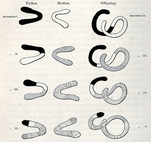 Inasmuch as the germ-plasm is seated, according to our theory, in the nucleus, the necessary reduction can only be produced by nuclear division; and quite apart from any observation which has been already made, we may safely assert that there must be a form of nuclear division in which the ancestral germ-plasms contained in the nucleus are distributed to the daughter-nuclei in such a way that each of them receives only half the number contained in the original nucleus. After Roux’s256 elaborate review of the whole subject, we need no longer doubt that the complex method of nuclear division, hitherto known as karyokinesis, must be considered not merely as a means for the division of the total quantity of nuclear substance, but also for producing a division of the quantity and quality of each of its single elements. In by far the greater number of instances the object of this division is obviously to effect an equal distribution of nuclear substance in the two daughter-nuclei, so that each of the different qualities contained in the mother-nucleus is transferred to the two daughter-nuclei. This interpretation of ordinary karyokinesis is less uncertain than perhaps at first sight it may appear to be. We cannot, it is true, directly see the ancestral germ-plasms, nor do we even know the parts of the nucleus which are to be looked upon as constituting ancestral germ-plasm; but if Flemming’s original discovery of the longitudinal division of the loops lying in the equatorial plane of the nuclear spindle is to have any meaning at all, its object must be to divide and distribute the different kinds of the minutest elements of the nuclear thread as equally as possible. It has been ascertained that the two halves produced by the longitudinal splitting of each loop never pass into the same daughter-nucleus, but always in opposite directions. The essential point cannot therefore be the division of the nucleus into absolutely equal quantities, but it must be the distribution of the different qualities of the nuclear thread, without exception, in both daughter-nuclei. But these different qualities are what I have called the ancestral germ-plasms, i.e. the germ-plasms of the different ancestors, which must be contained in vast numbers, but in very minute quantities, in the nuclear thread. The supposition of a vast number is not only required by the phenomena of heredity but also results from the comparatively great length of the nuclear thread: furthermore it implies that each of them is present in very small quantity. The vast number together with the minute quantity of the ancestral germ-plasms permit us to conclude that they are, upon the whole, arranged in a linear manner in the thin thread-like loops: in fact the longitudinal splitting of these loops appears to me to be almost a proof of the existence of such an arrangement, for without this supposition the process would cease to have any meaning.