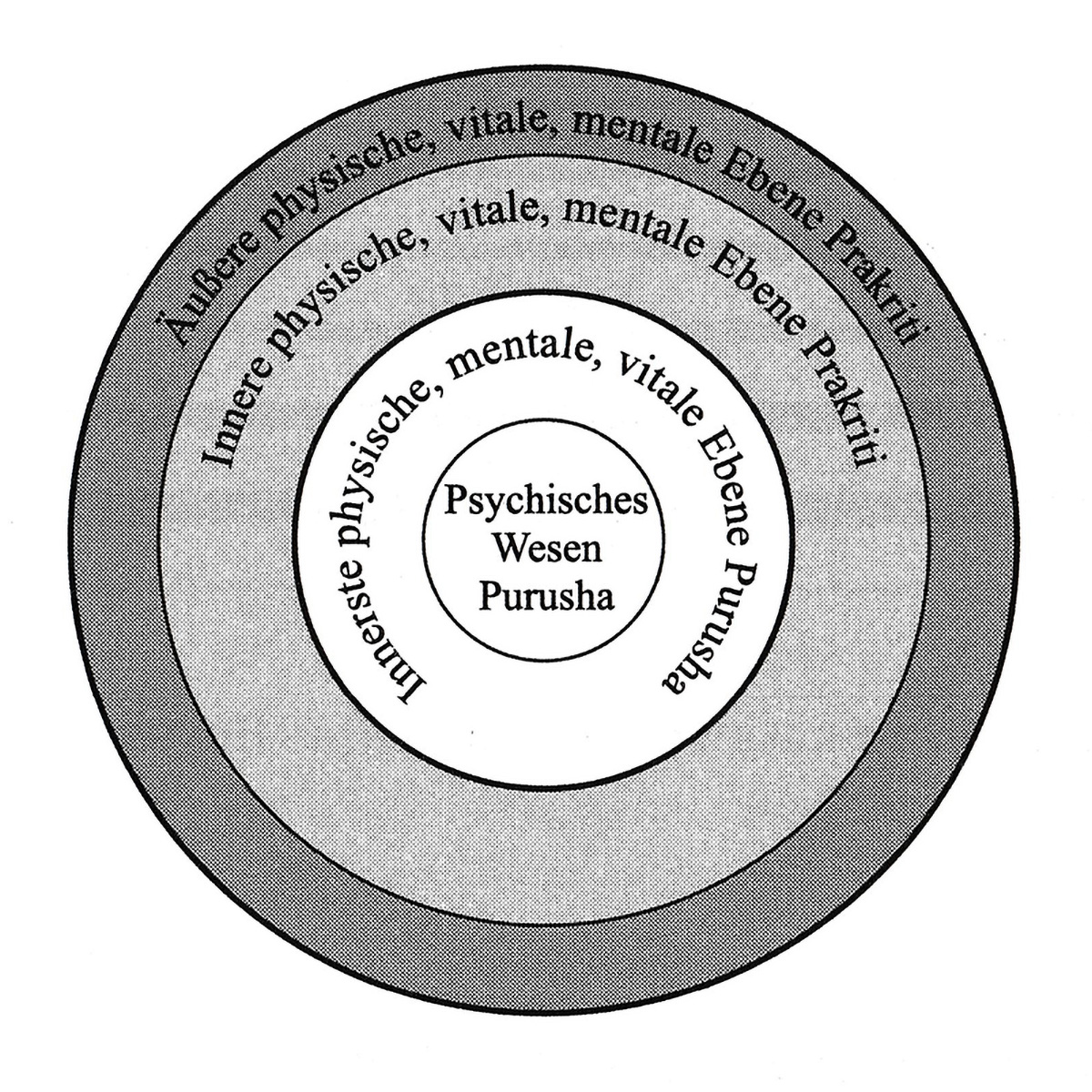 Die äußere Person und das innere Wesen dahinter machen unsere phänomenale oder instrumentale Person aus und gehören zur Natur oder Prakriti. Sie bringen drei entsprechende Teile hervor – das Physische ( das körperliche Wesen), das Vitale (das vitale Gefühls-Wesen) und das Mentale (das mentale, denkende Wesen). Das innerste Wesen ist das wahre Wesen, der Purusha. Im Purusha gibt es eine innerste mentale Ebene, die innerste vitale Ebene und eine innerste physische Ebene und ganz im innersten Kern das psychische Wesen oder die Seele. Das psychische Wesen wird meist als das innerste Wesen bezeichnet (Bild 1).