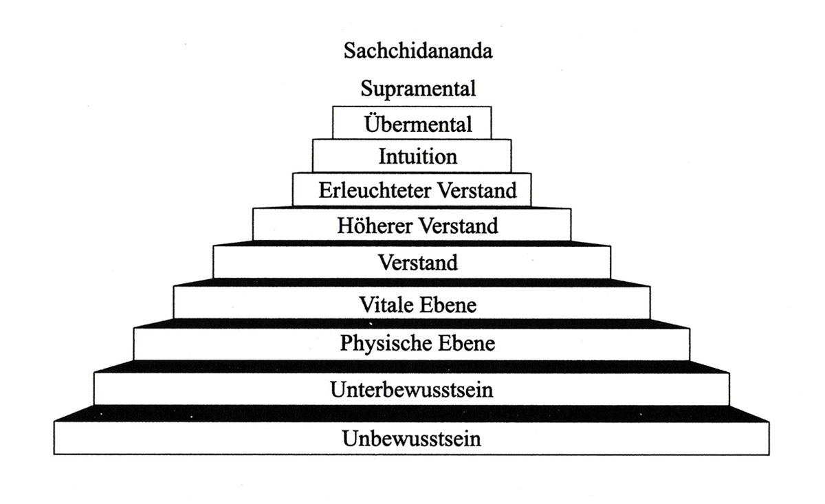 Das vertikale System ist wie eine Treppe aufgebaut, die aus verschiedenen Abstufungen, Ebenen oder Einteilungen des Bewusstseins besteht, die vom untersten – dem Unbewussten – bis zum höchsten, Sachchidananda, reichen (Bild 2).