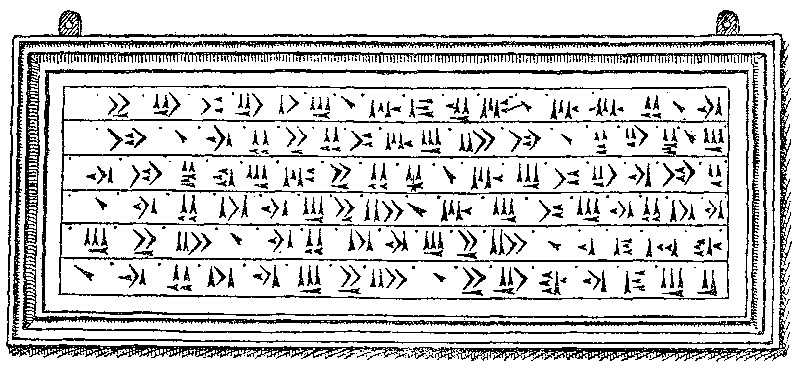 I followed the direction of his gaze and saw an oblong frame enclosing a large photograph of an inscription in the weird and cabalistic arrow-head character. I looked at it in silence for some seconds and then, somewhat disappointed, remarked: