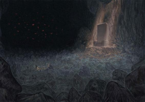 Со стен, потолка и пола всюду свисали коконы. Большие и маленькие, глухо мычащие и недвижные, дергающиеся и качающиеся под потолком, человекоподобные и бесформенные. Такое чувство, будто я в кунсткамере. Коконы, коконы, коконы, коконы… везде они. Ещё и непонятная мягкая поверхность между ними, как будто живая слизь, захватившая всё помещение. Эта вязкая жижа, словно по своей воле, не хочет пропускать меня вперед… Безуспешно пытаясь ничего не трогать и не поскальзываться, я с трудом поспевал за темпом А, которая просто плыла по этой поверхности, словно ей ничего не мешало.