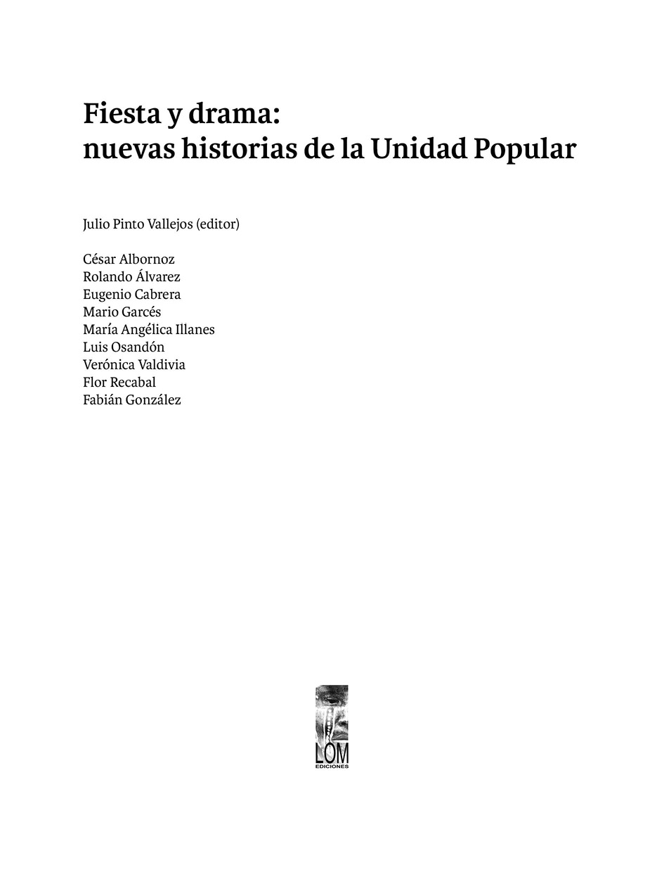 En un contexto de tales características, las motivaciones que llevaron a la confección de Cuando hicimos historia adquieren una fuerza y urgencia renovadas, sobre todo considerando que ese primer esfuerzo dejó, como lo reconocimos expresamente en su momento, numerosos aspectos y actores sin tratar. Considerando también, y lo decimos con sincero orgullo, que él fue muy bien recibido por la comunidad lectora nacional y latinoamericana. Convocados por tales constataciones, varias de las autoras y autores de la anterior obra nos hemos vuelto a congregar bajo el alero de la Colección Historia de LOM para elaborar una suerte de continuación de dicha iniciativa, nutrida obviamente por las reflexiones y transformaciones de estos últimos diez años. Lo hemos hecho, por tanto, abordando nuevos procesos, actores y temáticas, e incorporando también a nuevos integrantes, cuyos campos de especialización nos parecieron particularmente relevantes para avanzar hacia una visión más amplia y matizada de lo que fueron los años de la Unidad Popular. El resultado de este trabajo, que nos ha tenido ocupados desde comienzos del emblemático año 2013, es lo que ofrecemos ahora bajo el título, también actualizado, de Fiesta y drama: nuevas historias de la Unidad Popular.