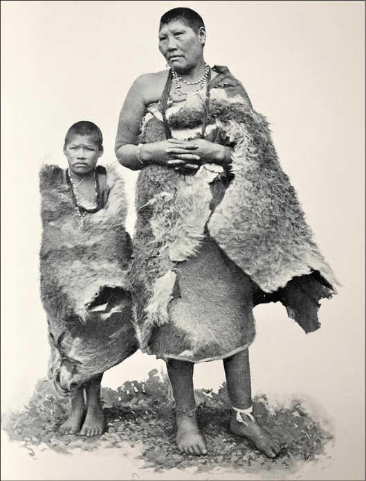 De lo contrario, toda la protección consiste en una manta, grande o chica, dependiendo de los recursos y las oportunidades, normalmente hecha de piel de guanaco, pero también, de vez en cuando, de piel de zorro. Las piernas siempre están desnudas. Cuando caminan, se abrigan con esta capa, que queda sujetada por una cuerda o por un brazo doblado sobre el pecho, y cuando se sientan junto al fuego, suelen dejarla caer a la cadera. Los niños, al menos los chicos, suelen estar completamente desnudos, incluso cuando la nieve se acumula alrededor. No usan sombrero, pero el cabello grueso que les cae en mechones largos, se mantiene ordenado con una cuerda atada alrededor de la cabeza. Solamente durante sus peleas, y posiblemente en otras ocasiones solemnes, llevan un parche triangular alrededor de la frente, hecho de la suave piel de la cabeza del guanaco juvenil.