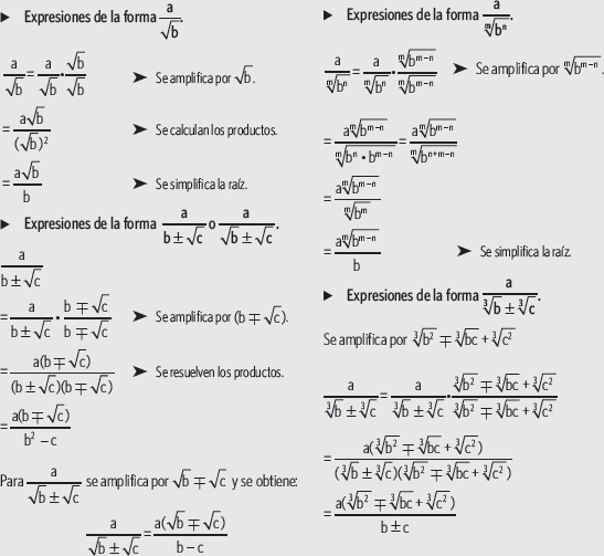 Cuando una fracción tiene raíces en el denominador es posible encontrar una expresión equivalente sin raíces en el denominador por medio de la racionalización. Para ello se amplifica por una expresión adecuada, de forma que permita expresar el denominador sin raíces.