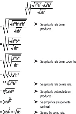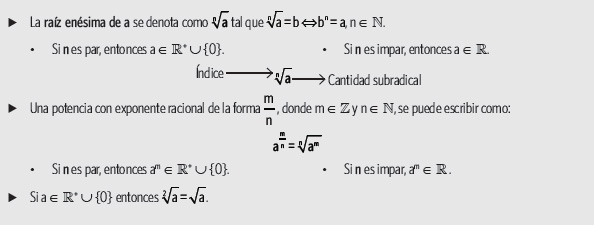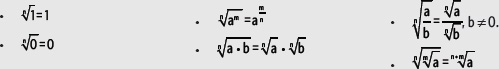 Es importante tener en cuenta que para los exponentes racionales también se cumplen las propiedades de las potencias, y que de estas se pueden deducir las siguientes propiedades para raíces enésimas: