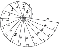 Esta construcción geométrica que representa las raíces cuadradas de los números naturales se conoce como la espiral de Teodoro.