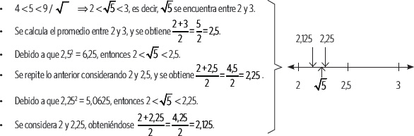 Se acota el número irracional x, tanto inferior como superiormente, es decir, se determinan dos números racionales a y b tal que a < x < b, luego se calcula el promedio entre estos números y se prosigue tantas veces como sea necesario.