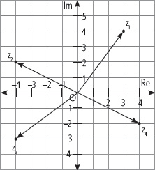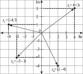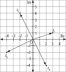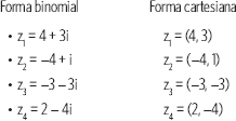 1. En el plano de Argand se han representado los números complejos z1, z2, z3 y z4. ¿Cuál es su representación en forma binomial y cartesiana?