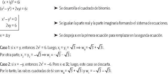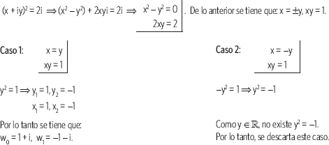 Se resuelve la ecuación (x + iy)2 = 2i, luego se tiene: