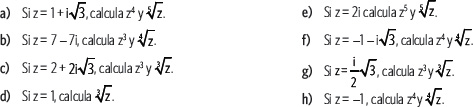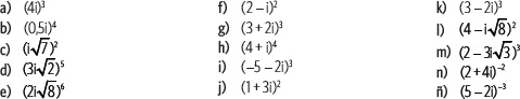 Calcula el valor de la potencia de cada número complejo.