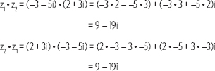 Si z1 = –3 – 5i, z2 = 2 + 3i, verifica que se cumple la propiedad conmutativa.