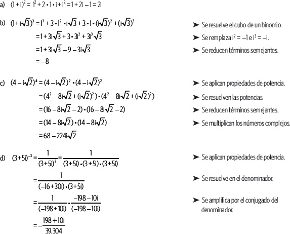 Se puede calcular la potencia de un número complejo utilizando las expresiones del cuadrado y del cubo de binomio y luego remplazar los valores de las potencias de i cuando corresponda.