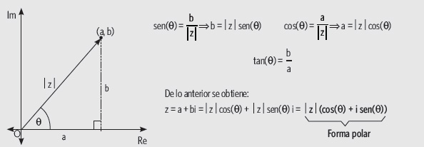 Dado un número complejo z = a + bi, representado en el plano de Argand, se tienen las siguientes relaciones: