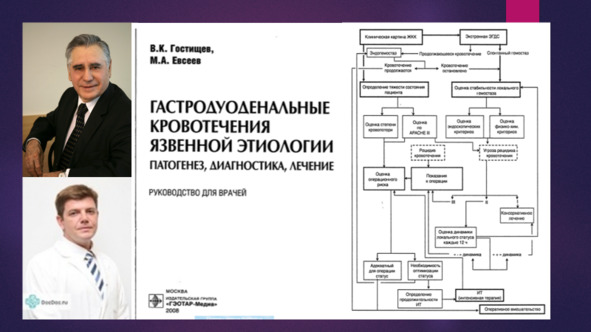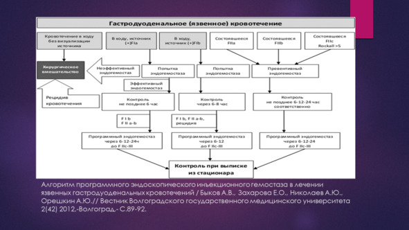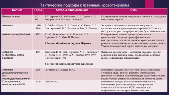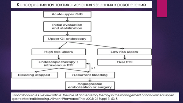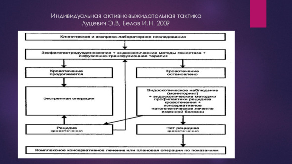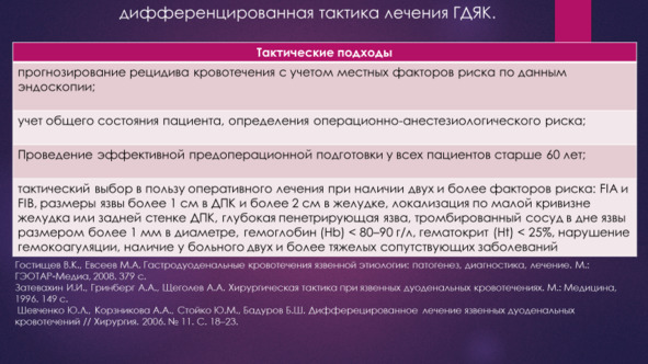 Данный тактический подход подробно описан в монографиях Гостищева В. К., Евсеева М. А. Гастродуоденальные кровотечения язвенной этиологии. Руководство для врачей. М.:Гэотар, 2008., Вербицкого В. Г., Багненко С. Ф., Курыгина А. А. Желудочно-кишечные кровотечения язвенной этиологии: патогенез, диагностика, лечение. 2004.