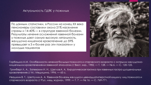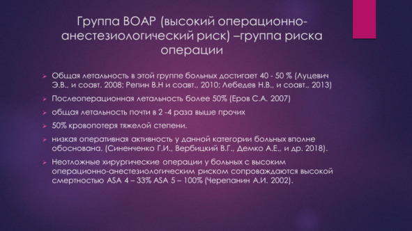 Активная и активно-выжидательная тактика лечения больных пожилого и старческого возраста с язвенными гастродуоденальными кровотечениями приводит к высокой послеоперационной летальности и поэтому не приемлема для данной категории больных (Кубышкин В. А., и соавт., 2013 г; Шугаев А. И. и соавт., 2009). Можно следующим образом охарактеризовать больных с максимальной степенью операционно-анестезиологического риска и наибольшей вероятностью летального исхода после экстренной операции. Это прежде всего пациенты старше 60 лет, имеющие сопутствующую патологию, поступившие в тяжелом состоянии, с нестабильной гемодинамикой, с указанием на перенесенные ранее сердечно-сосудистые коллапсы и тяжелой кровопотерей.