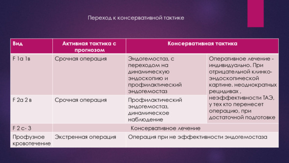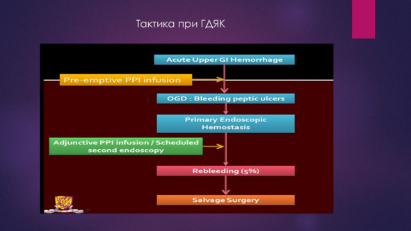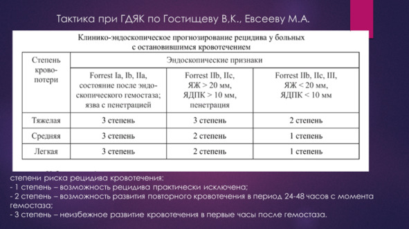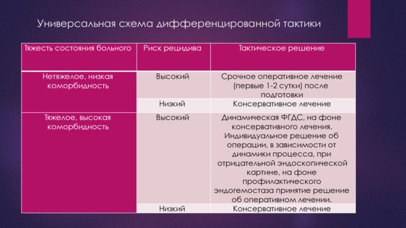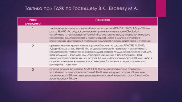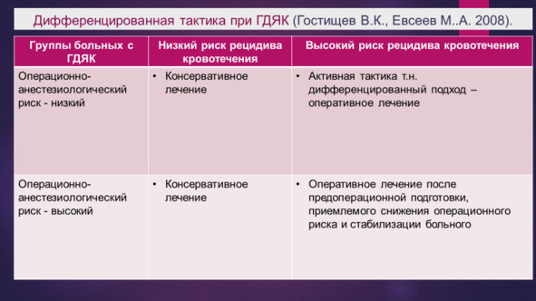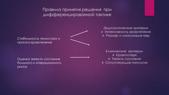 По мнению Вербицкого В. Г., Багненко С. Ф., Курыгина А. А. 2004 г. центральная проблема тактики при ГДЯК дифференцированный подход с учетом риска рецидива и риска операции. Она основана на клинико-эндоскопическом подходе к оценке стабильности гемостаза и степени тяжести пациента.