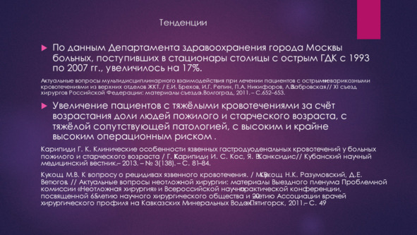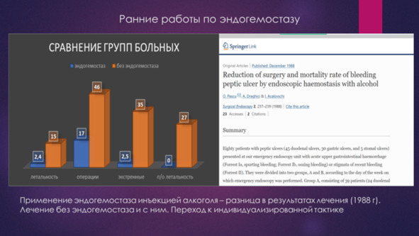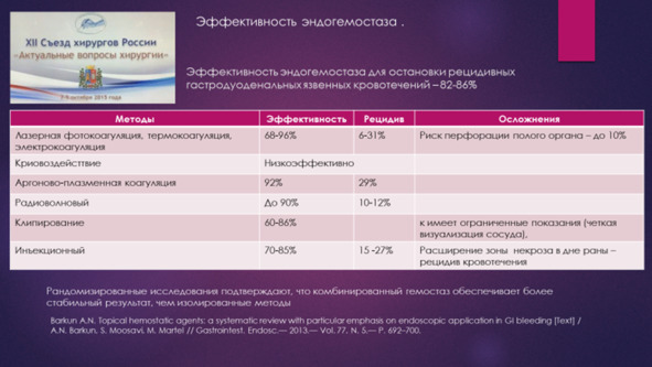 При этом рецидивы язвенного кровотечения стали принципиально расцениваться как ошибки и погрешности в применении методов неоперативного гемостаза. Так А. А. Щеголевым (2024 г) в выступлении на конференции приводит 264 случая неоперативного гемостаза всего лишь с 1 случаем рецидива кровотечения.