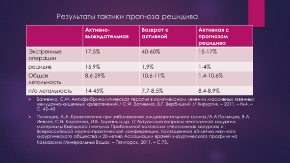 По данным В. К. Гостищева и М. А. Евсеева (2005), снижение хирургической активности в экстренных ситуациях ниже 10% приводит к снижению общей летальности до уровня 1—2%. Операции при язвенных гастродуоденальных кровотечениях приносят плохие результаты. (Шаповальянц С. Г., Михалев А. И., Бабкова И. В. 2017) При возникновении рецидива кровотечения частота неблагоприятных исходов лечения резко возрастает, общая летальность достигает 15%, а послеоперационная летальность 40% и более (Асташов В. П., Клейн В. Е. 2005, Багненко С. Ф., Синеченко Г. И., Вербицкий В. Г., Курыгин А. А. 2007, Гостищев В.К, Евсеев М. А. 2003, Гостищев В. К., Евсеев 2005, Затевахин И. И., Щеголев А. А., Титков Б. Е. 2005, Луцевич Э. В., Белов И. Н. 2008). Особенно это касается пациентов с повышенным операционно-анестезиологическим риском