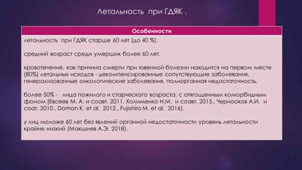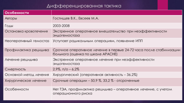 Таким образом, высокий риск операции, имеющийся у пожилых коморбидных больных, является на ряду с риском рецидива ГДЯК важным фактором летальности, который должен учитываться при выборе тактики лечения. У этой категории больных важно избегать операции, предпочтительным является неоперативный гемостаз, а в случае выполнения операции предпочтительными являются щадящие не радикальные, а условно-радикальные, паллиативные операции. Выработка тактики лечения с учетом риска рецидива ГДЯК и операционного риска легло в основу создания дифференцированной тактики.