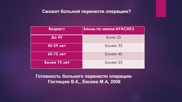 Гостищев В. К., Евсеев М. А. 2008 г. предлагают четкие критерии готовности больного к оперативному лечению, где соответственно возрасту предлагается строго определённое количество баллов шкалы APACHE 3. Эти ученные так же смогли установить временные сроки необходимые для подготовки больных к операции.