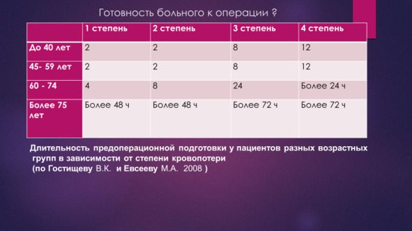 Гостищев В.К, Евсеев М. А. максимально делают подход к оценке риска как операции, так и рецидива, так и готовности больного к операции объективным. Для этого используется шкала APACHE 3. Комбинированный гемостаз в «проблемной» группе используется для пролонгации без рецидивного периода для предоперационной подготовки больного.