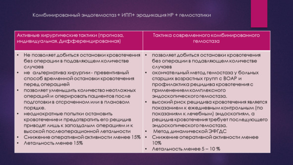 Дальнейшее совершенствование неоперативного гемостаза, который стал применятся как окончательный, а не временный, пролонгирующий без рецидивный период, заключающееся в широком применении ингибиторов протонной помпы, сандостатина, гемостатиков, эрадикационной терапии, повышении эффективности методов эндоскопического гемостаза, привело к изменениям в тактике лечения.