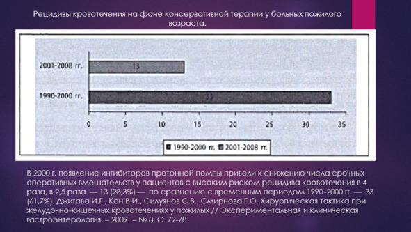 Уже в «Руководстве по неотложной хирургии органов брюшной полости» под редакцией академика В.С.Савельева 2004 г., описывалась тактика относительно категории больных высокого операционного риска: «… мы обязаны обратить внимание еще на одну группу больных, которым неотложная операция любого объема является неприемлемой. Это больные преклонного возраста с предельной степенью операционно-анестезиологического риска, как правило, обусловленного декомпенсацией сопутствующих заболеваний на фоне перенесенной кровопотери. Такие больные, даже при указаниях на высокий риск рецидива кровотечения (а иногда и при продолжающемся кровотечении) вынужденно ведутся консервативно с активными динамическими ЭГДС. Консервативная терапия включает в себя: интенсивную коррекцию кровопотери и вызванных ею синдромных нарушений, введение гемостатических и антифибринолитических средств, ингибиторов протоновой помпы под контролем внутрижелудочного рН, антигеликобактерную терапию. Контрольные эндоскопические исследования проводятся на 1, 2,4 сутки и вплоть до исчезновения риска рецидива кровотечения».