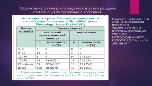 Выделение тактических групп позволяет выделить среди них так называемую «проблемную» группу, группу высокого риска рецидива и высокого операционного риска, дающую до 90% летальных исходов. Именно решение вопросов точного выделения данной группы больных с ГДЯК и эффективного их лечения, в условиях, когда неоперативный гемостаз не позволяет избежать рецидива кровотечения, что делает операцию неизбежной.