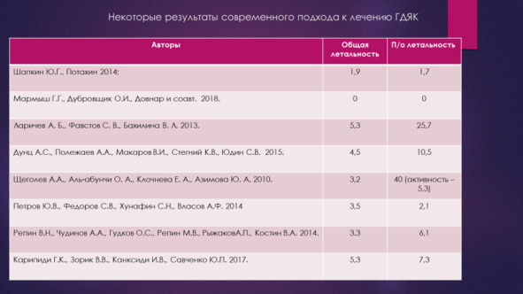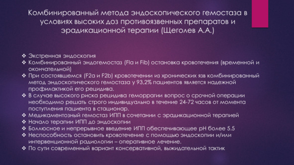 Современный подход к лечению ГДЯК это консервативный подход с применением комбинированного эндоскопического и медикаментозного гемостаза и эндоскопический гемостаз на фоне динамического эндоскопического наблюдения.