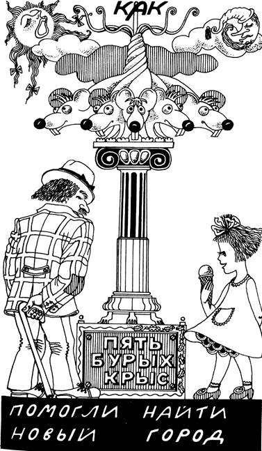 Сколько бы теперь ни дул ветер, какой бы ни шел снег, как бы буря ни швыряла им сосульки в лицо, они держались за длинные закрученные хвосты пяти бурых крыс, пока не пришли туда, где сейчас стоит Крем-Торт-таун. Бурые крысы спасли их и нашли место для нового городка. Потому-то и стоят на постаменте посреди главной площади пять бурых крыс с опущенными в снег носами и высоко поднятыми закрученными хвостами.