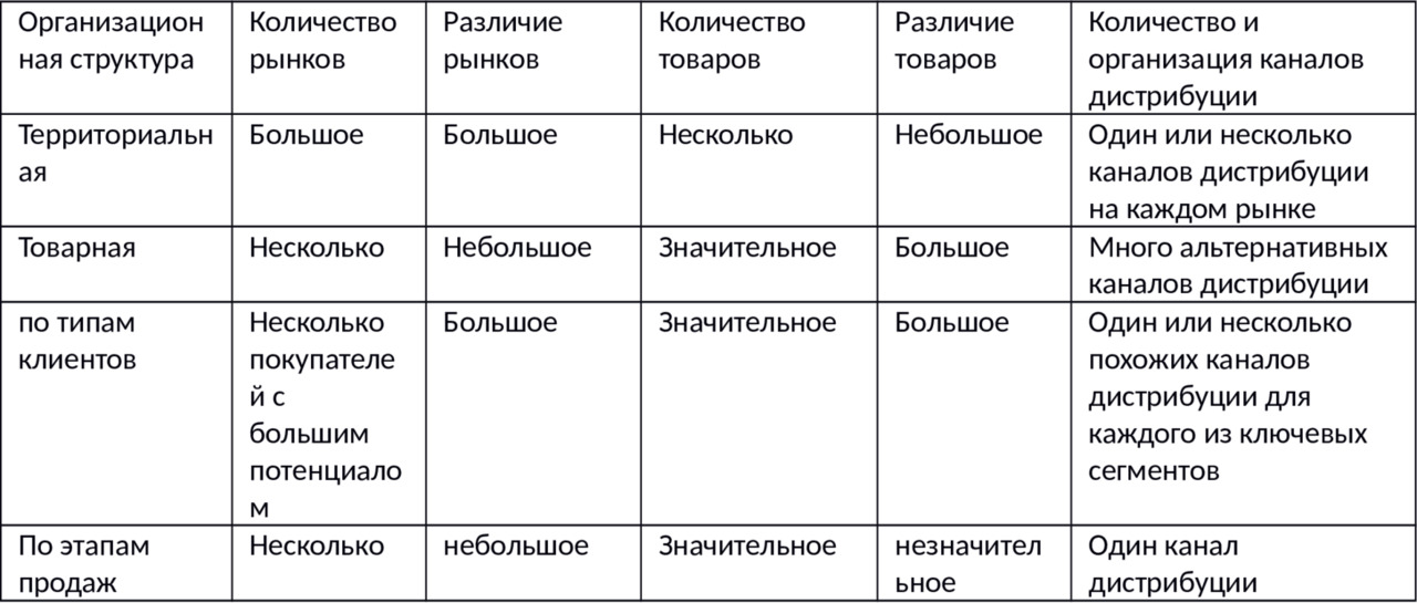 Для выбора оптимальной структуры организации деятельности подразделения продаж возможно использовать данные, представленные в таблице 4 (Цыбульский)
