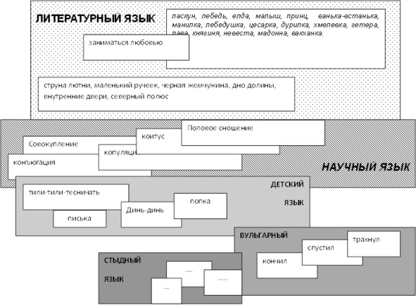 Ю. П. Прокопенко в конце прошлого века собрал некоторые известные синонимы из сексуальной лексики, свойственные российской сексуальной культуре. Если расставить эти термины по предлагаемым выше уровням, то получится следующая картина: