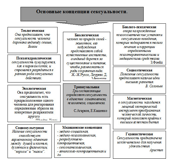 Таким образом, тривиумальная концепция сексуального развития исходит из гипотезы о том, что комплексность изучения соматосексуального, психосексуального и социокультурного полового развития наиболее полно и динамично отражает онтогенез сексуальности человека.