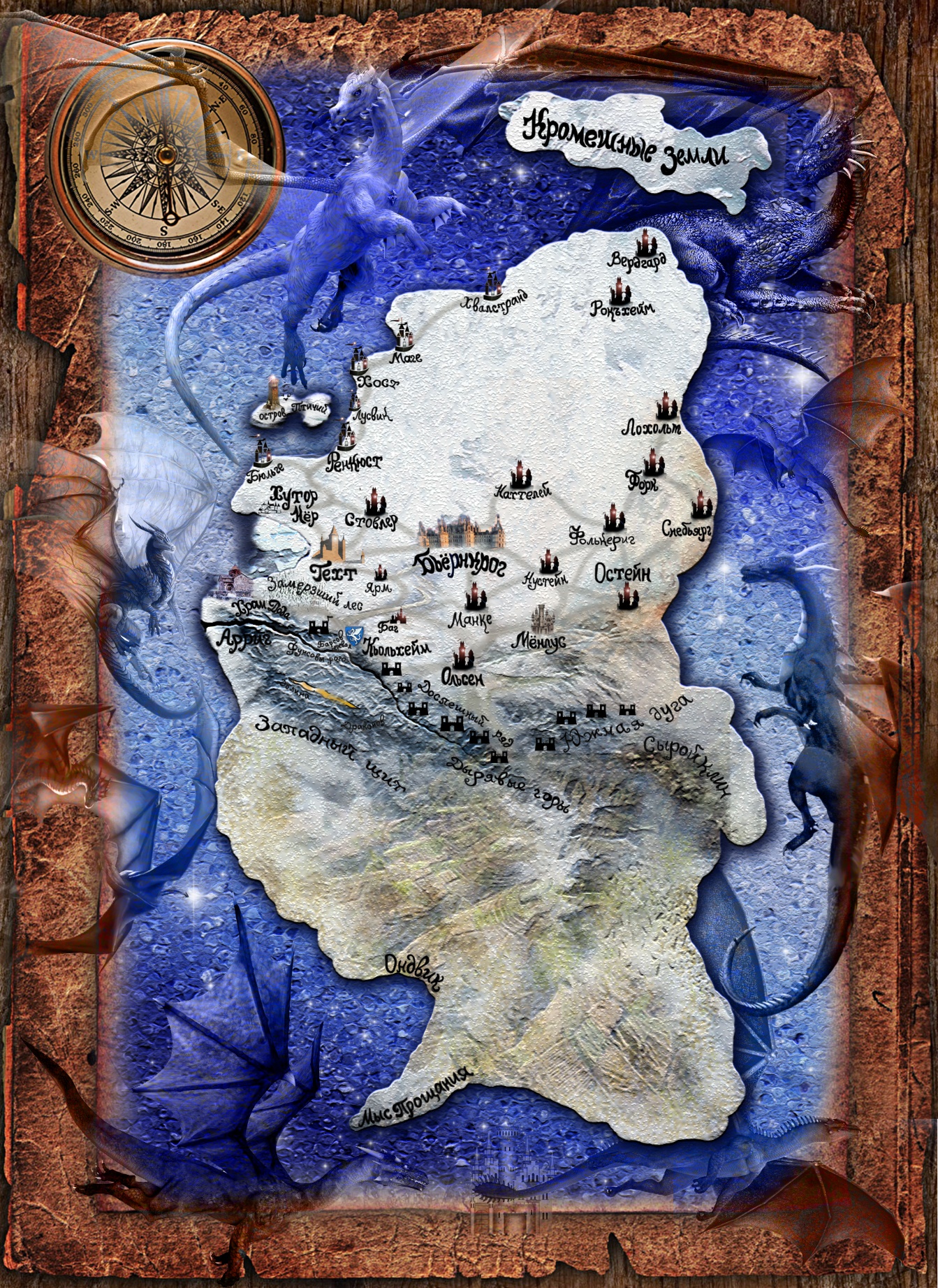 «Тогда семеро из славнейших соратников короля, рыцари, носящие в гербе знак Дракона, сложили к ногам государя свое оружие, и из мечей тех выкована была стальная корона, и, приняв ее, Хлодвиг поклялся, что сам он и потомки его всегда будут беречь и защищать землю Фимбульветер…»