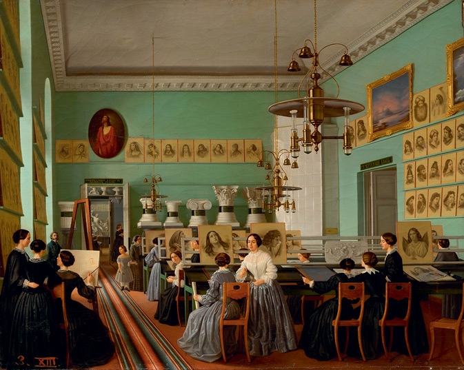 «В начале 1840 годов отношение к женскому образованию во многом определялось предубеждениями, касающимися в целом способности женщин к обучению. Женские классы Рисовальной школы функционировали как ее органическая часть и были элементом целостной педагогической системы. Это учебное заведение открывало перед девушками возможность совершенствоваться в живописи и в дальнейшем подавать работы в Академию для получения звания художника <…> Одновременно в женских классах большое внимание уделялось декоративно-прикладному искусству, в особенности традиционно “женским” направлениям (текстиль, керамика, а также акварель как станковая и декоративная техника)»[81].