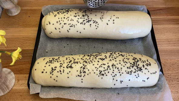 5. Выкладываем заготовки на противень застеленный пергаментом, смазываем масляной суспензией и щедро посыпаем кунжутом. Заготовки накрываем и оставляем на расстойке минут на 45.