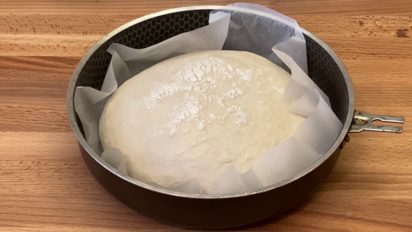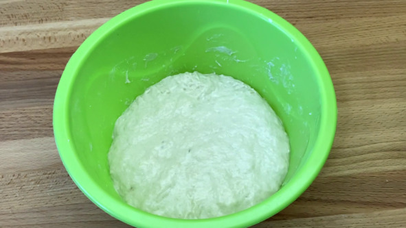 2. Выкладываем тесто в миску, где оно будет расстаиваться, миску предварительно смазываем растительным маслом. Тесто накрываем и оставляем на расстойке на 1 час или до удвоения теста в объёме.