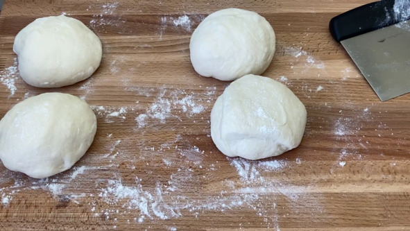 3. Выкладываем тесто на рабочую поверхность присыпанную мукой. Тесто округляем, затем делим на 4 равные части и каждую часть скатываем в шарик. Оставляем для отдыха на несколько минут, обязательно тесто накрыв.