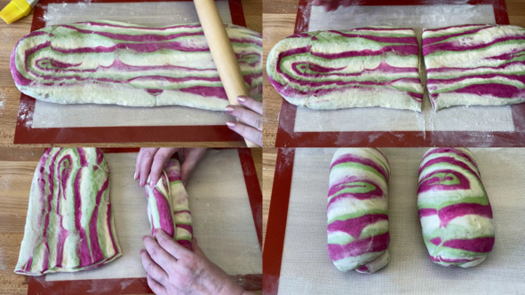 4. Выкладываем тесто на рабочую поверхность, которую предварительно присыпаем мукой. Сначала разминаем в небольшую лепёшку белое тесто, затем на белое тесто выкладываем лепёшку другого цвета, подгоняем её по размеру по отношению к белому тесту, поверх выкладываем последнюю лепёшку и также подгоняем её по размеру. Раскатываем трёхслойное тесто, придавая ему овальную форму, а затем сворачиваем тесто рулетом. Выкладываем рулет швом вниз, складываем пополам и делаем надрез, не доходя до края примерно полтора-два сантиметра. Тесто разворачиваем разрезом вверх, немного присыпаем мукой, раскатываем до тех пор, пока ширина пласта не увеличится примерно раза в два. Разрезаем пласт теста пополам и каждую половинку сворачиваем в рулет. Получаем 2 заготовки хлеба.