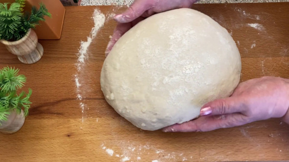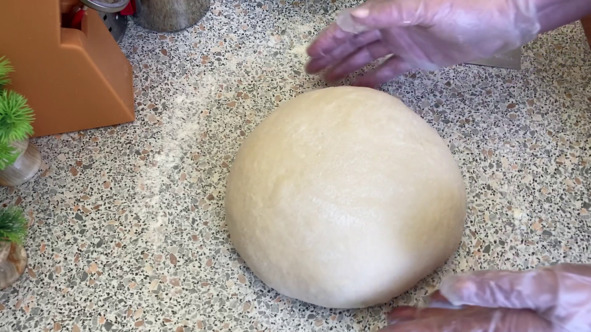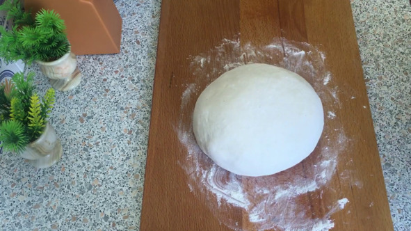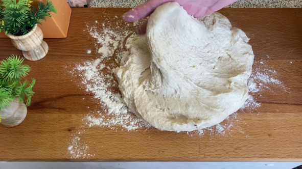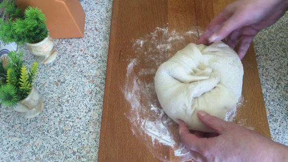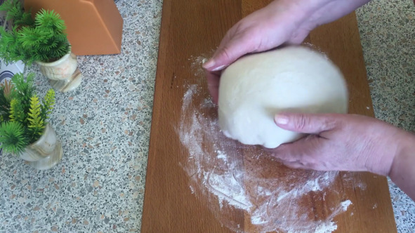 Выкладываем тесто на рабочую поверхность, присыпанную мукой, собираем края теста к середине, переворачиваем тесто гладкой стороной вверх, придаём тесту форму шара, накрываем и оставляем для отдыха минут на 15—20.