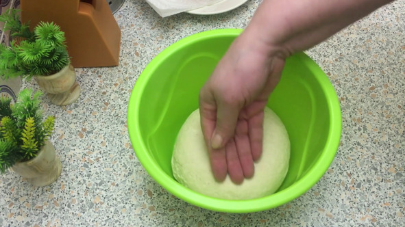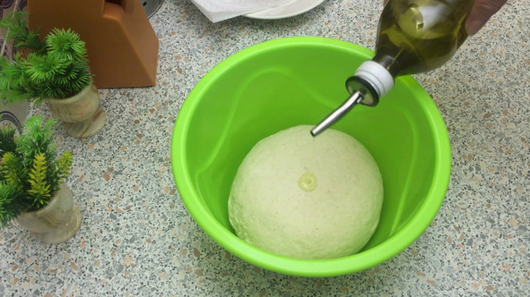 Собирая края теста к середине, тесто округляем и затем выкладываем в миску, смазанную растительным маслом.
