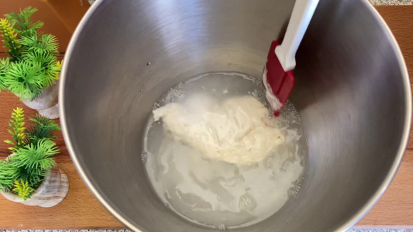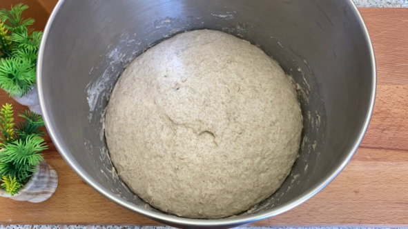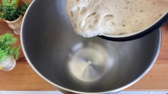 Замешиваем тесто в тестомесе (миксере) на небольшой скорости, а затем без перерыва завершаем замес теста на средней скорости. В процессе замешивания, при необходимости, корректируем гидратацию.