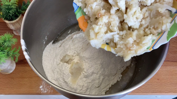 Добавляем воду, добавляем соль, растительное масло, выкладываем просеянную пшеничную муку, выкладываем картофельное пюре с жаренным луком.
