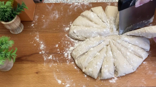 Выкладываем тесто на рабочую поверхность, присыпанную мукой. За время расстойки тесто должно стать более мягким, более липким. Это нормально, это за счёт картофельного пюре. При необходимости можно тесто подкорректировать небольшим количеством муки. Главное – не забить тесто мукой.