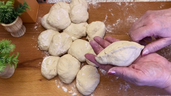 Каждый шарик расплющиваем в лепёшку, в середину лепёшки кладём начинку и далее лепим пирожок в форме лодочки.