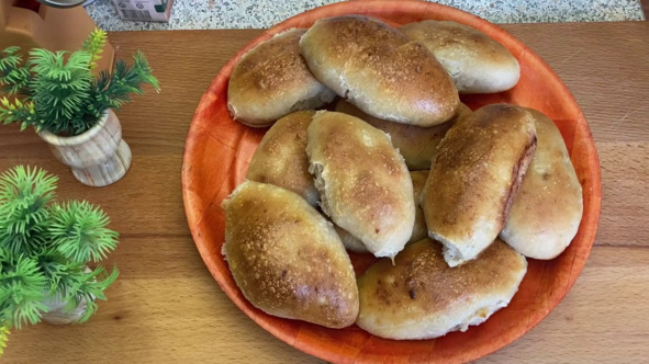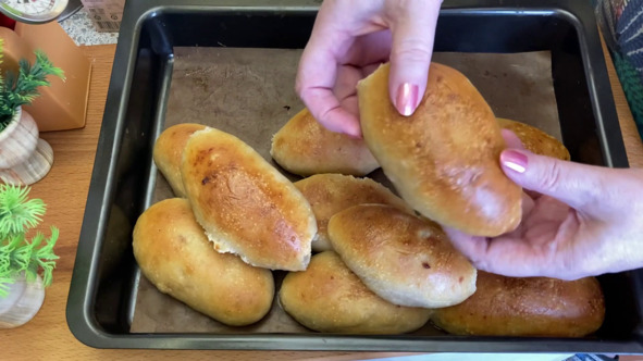 Остужаем пирожки на противне, где они выпекались, а затем выкладываем на блюдо либо в корзинку.